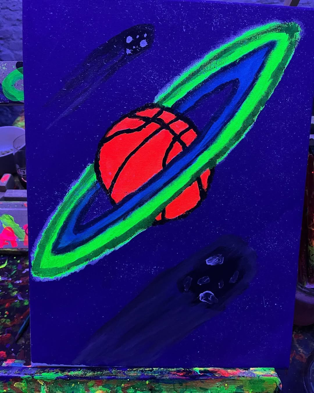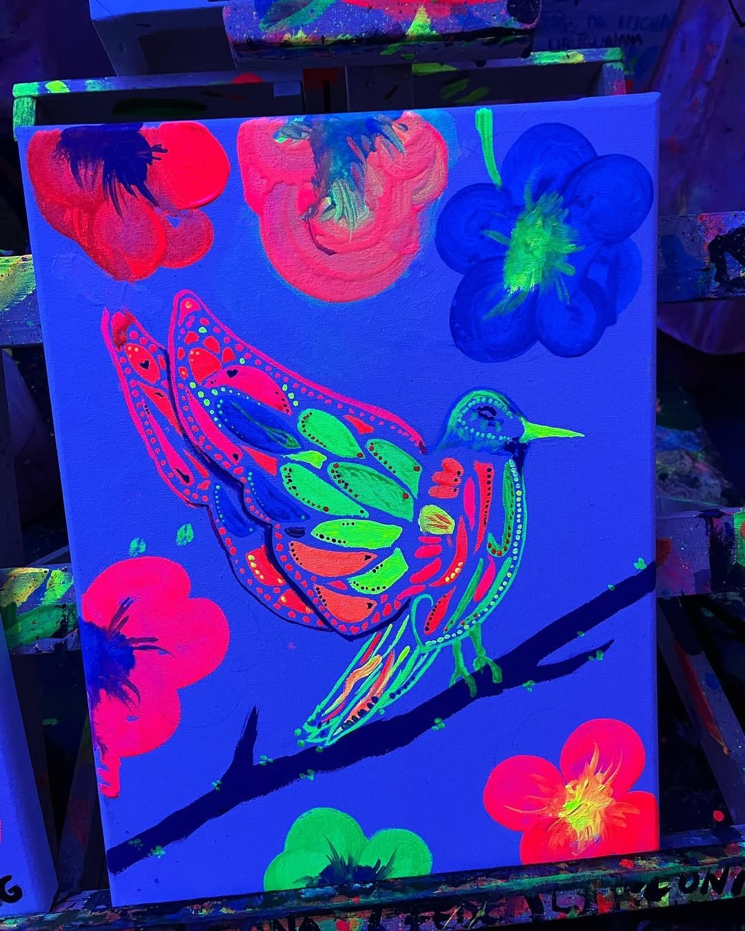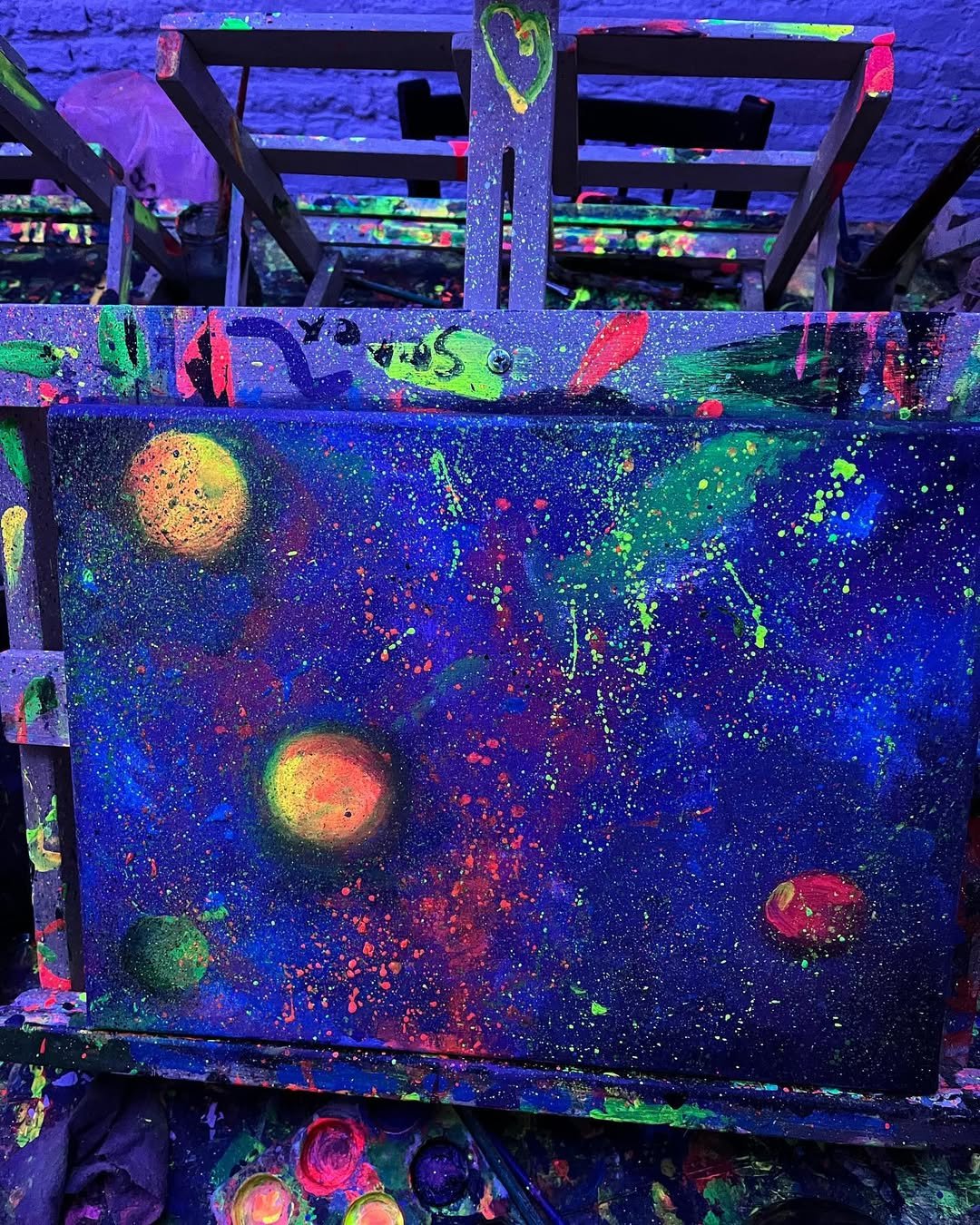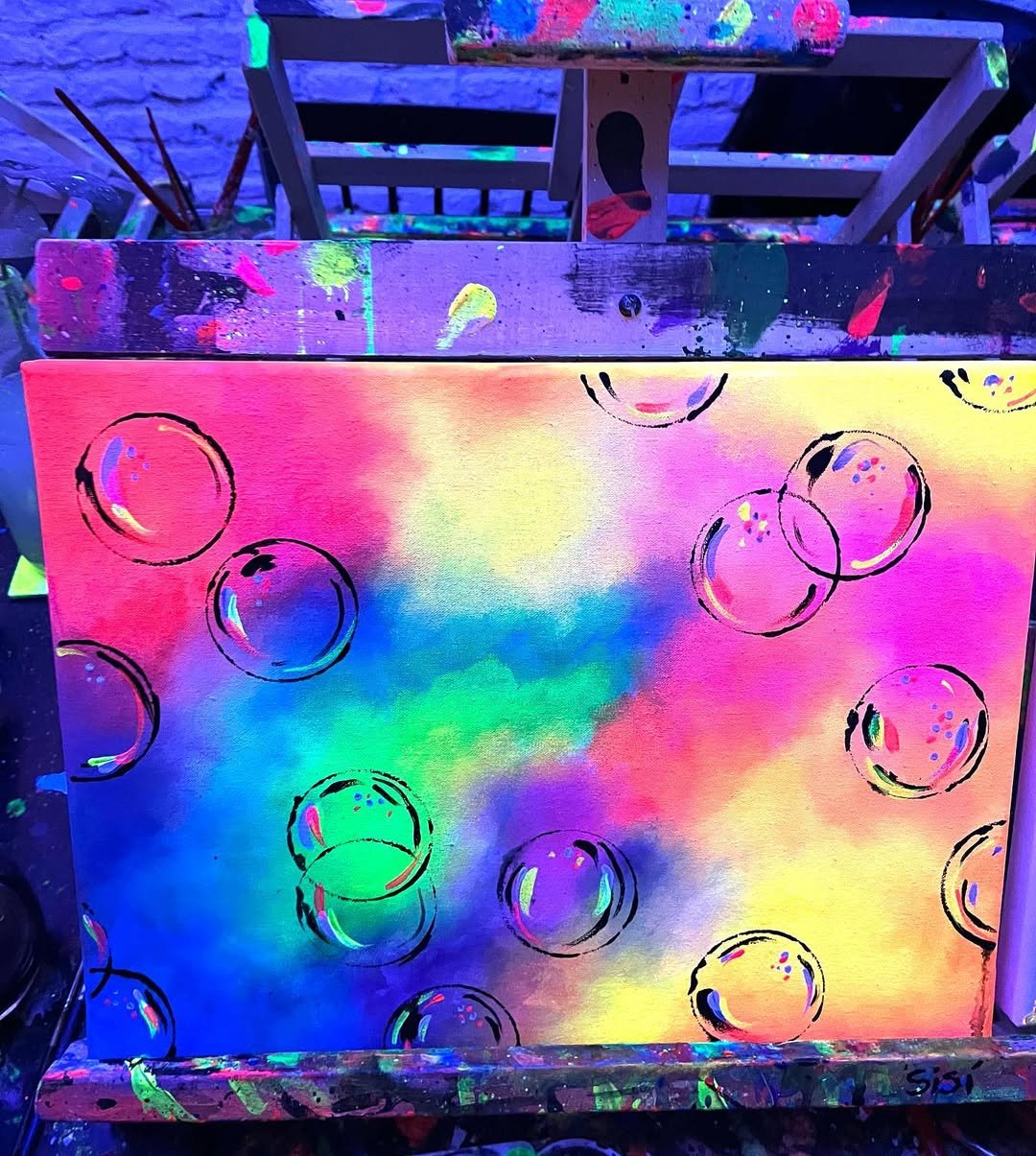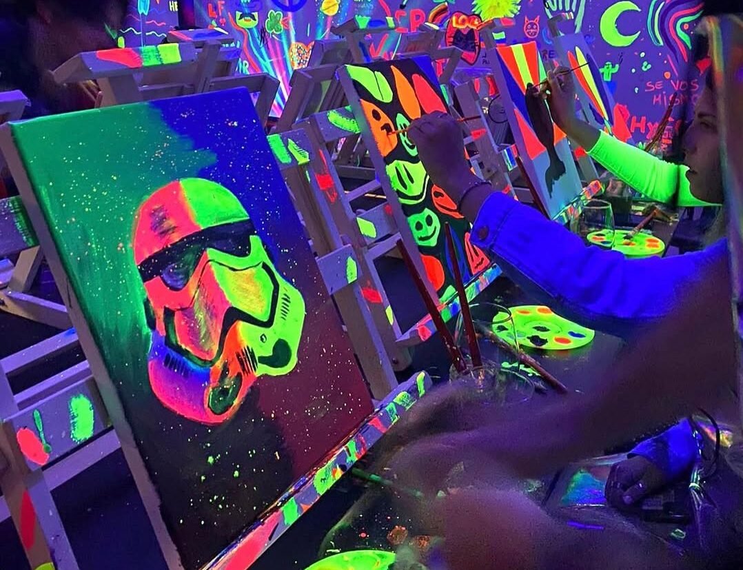La noche comienza antes de lo esperado: las luces bajan, los neones se activan y un murmullo colectivo recorre la sala. Gomas, pinceles, delantales y bastidores 30×40 cm ya esperan sobre cada atril. No importa si alguien nunca tocó un pincel: la consigna es relajarse, dejarse llevar y disfrutar. Las mismas manos que hace minutos ordenaban material, ahora mezclan pigmentos flúo, ríen y cautivan un lienzo que crecerá en segundos.