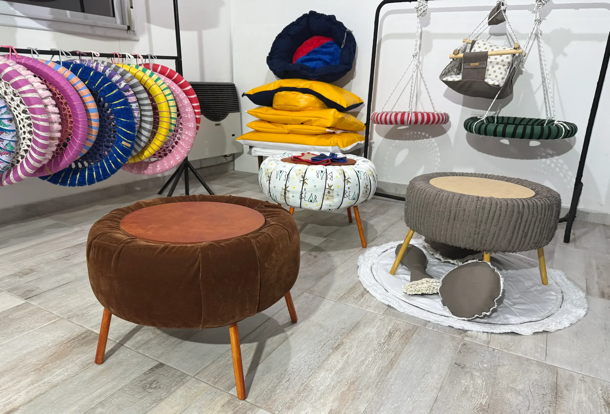Hoy, el taller de EcoCraft está repleto de neumáticos recuperados de gomerías y conocidos, apilados como bloques listos para renacer. Allí, cada cubierta vieja se convierte en hamacas circulares, mecedoras colgantes, andadores, camas para mascotas y mesitas estilo otomano. Combinan la robustez del caucho con la textura y color de telas reutilizadas (scrap textil), generando productos que cuentan más de una historia con cada detalle visible.