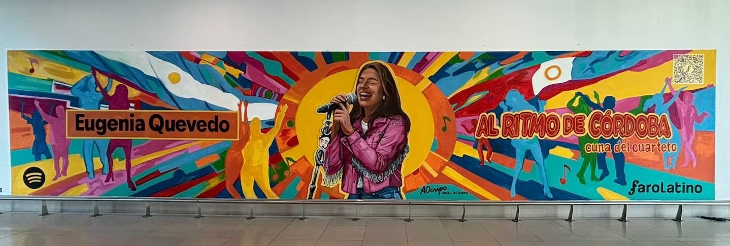 El lunes 15 de diciembre por la tarde, el Aeropuerto Internacional Ingeniero Aeronáutico Ambrosio Taravella se transformó en epicentro de un homenaje que mezcla música, arte urbano y emoción. Allí, bajo el murmullo constante de arribos y partidas, se inauguró un mural gigante dedicado a Eugenia Quevedo, una de las voces más queridas del cuarteto cordobés, que ahora dará la bienvenida a miles de viajeros con su imagen vibrante.