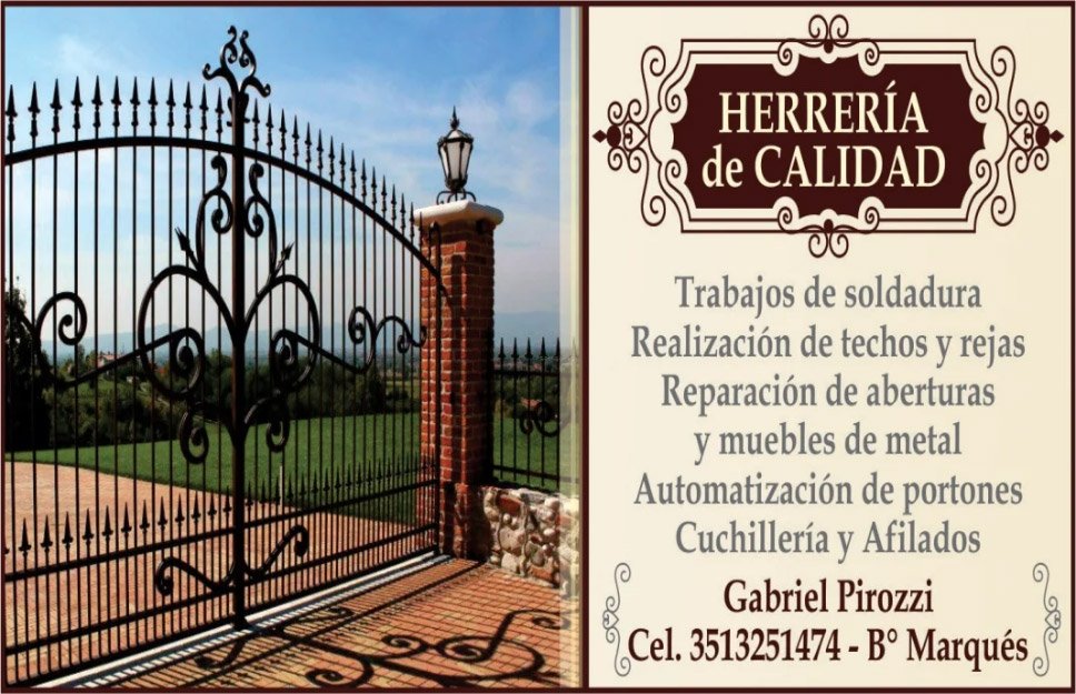 Trabajos de soldadura, realización de techos y rejas, reparación de aberturas y muebles de metal, automatización de portones, cuchillería y afilados. Gabriel Pirozzi.
