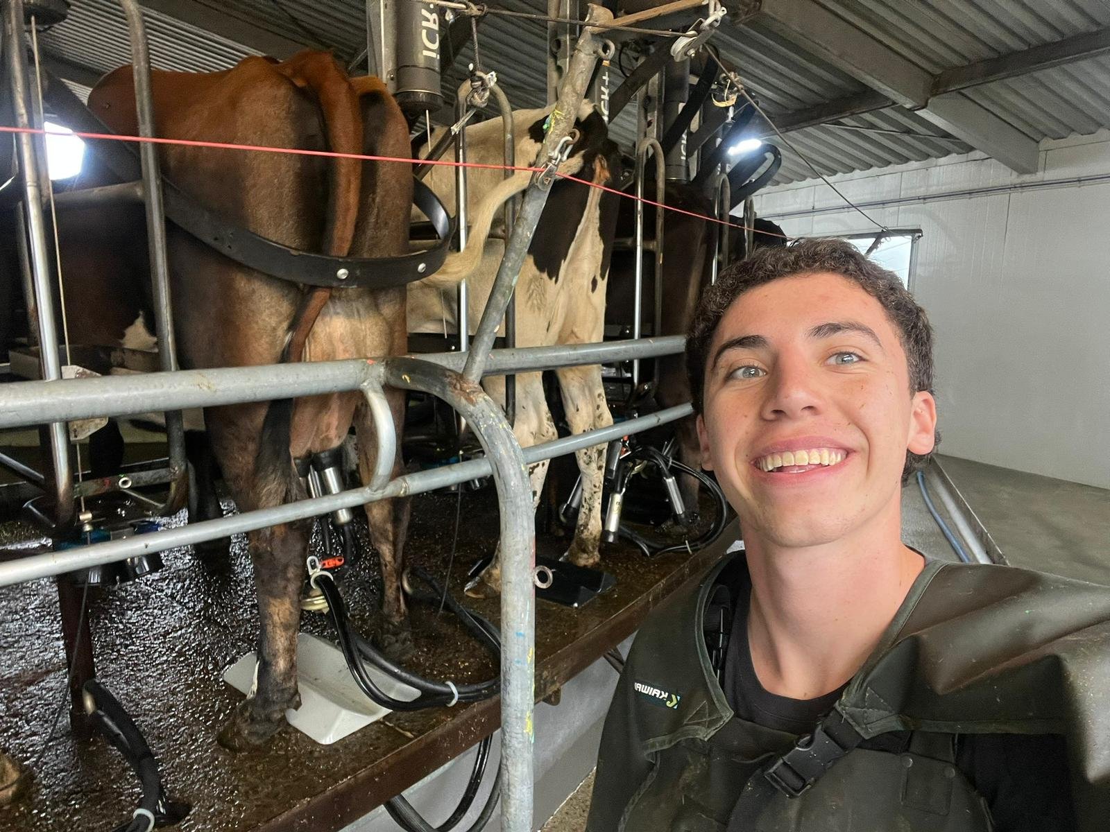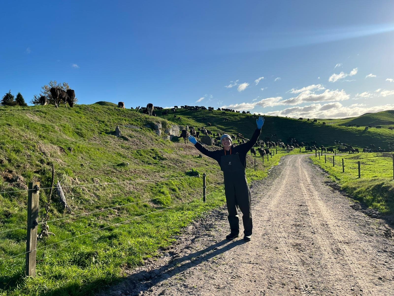 Su primer destino laboral fue un tambo en Mangakino, un pueblo en medio de la producción lechera. “Llegamos a tener entre 1,200 y 1,500 vacas”, cuenta sobre el enorme campo donde comenzó ordeñando hasta ganar confianza y nuevas responsabilidades. “Me dieron la oportunidad de aprender muchísimo”, valora. Pese a la distancia, el trabajo no le resultó ajeno: “No vi nada que no hubiera visto en campos argentinos”.